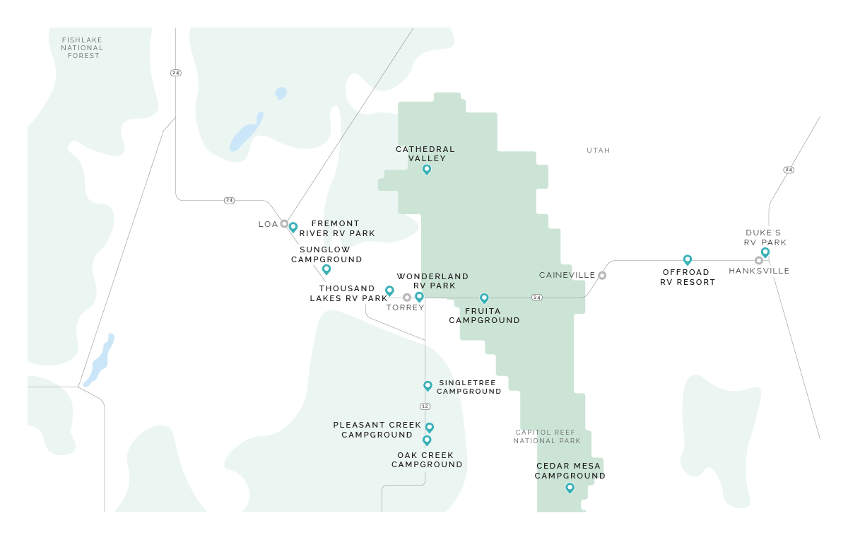 In this Capitol Reef RV camping guide, you’ll find tips on where to stay: Campgrounds inside Capitol Reef, private campgrounds just outside the park, public campgrounds in nearby Fishlake/Dixie National Forest, and other public land dispersed camping.