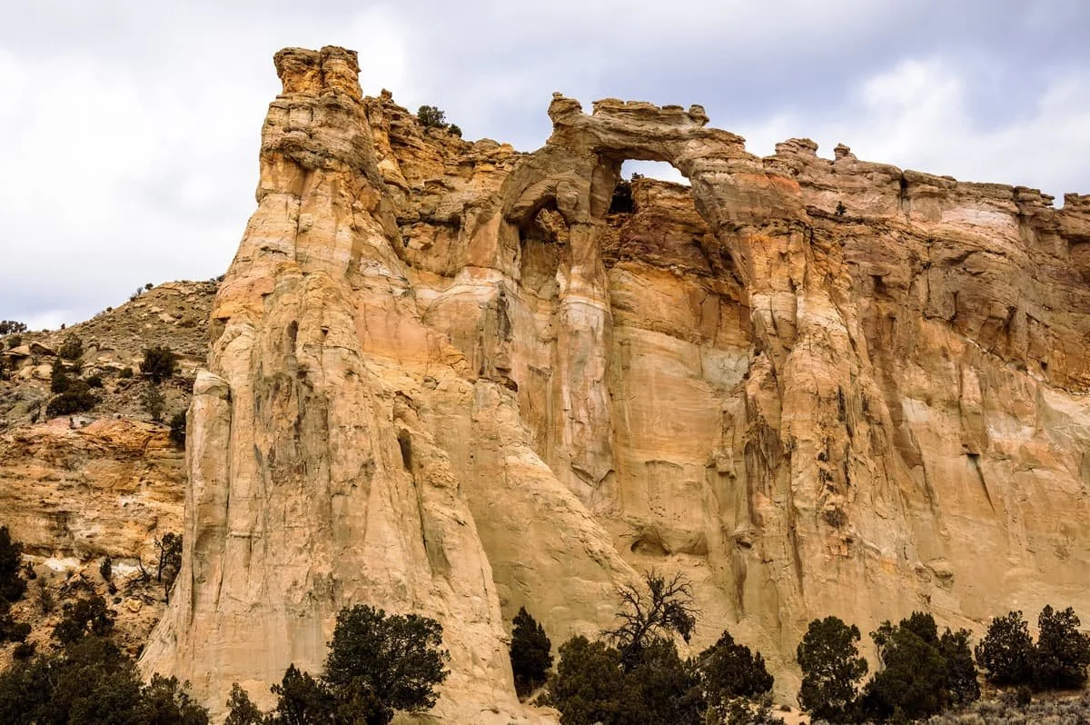This double arch is 10 miles down the unpaved Cottonwood Canyon Road, southeast of the park in Grand Staircase-Escalante National Monument. It stands 152 feet high with distinctive yellow and pink-speckled sandstone.